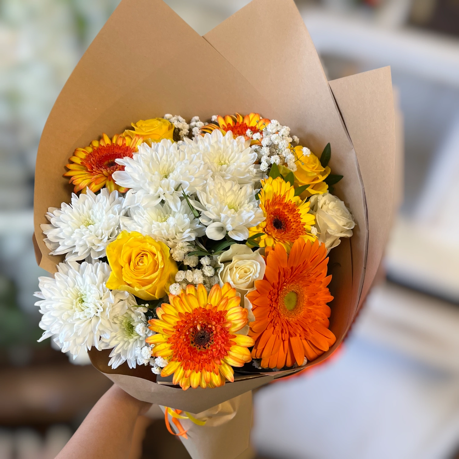 A Napfényes Ölelés csokorban a ragyogó sárga és friss fehér virágok találkoznak, hogy örömöt és melegséget sugározzanak minden pillanatban. Születésnapra, névnapra, évfordulóra, köszönetként vagy csak egy kedves meglepetésnek. **Fontos információ:** A csokrot a kiválasztott méretben készítjük el. Mivel friss virágokból, kézzel készül, az aktuális készlettől függően kisebb eltérések lehetnek a képen láthatóhoz képest, de az összhatás, a színvilág és az érték minden esetben megmarad. Nagykőrösön ingyenesen kiszállítjuk, vagy üzletünkben személyesen is átvehető.