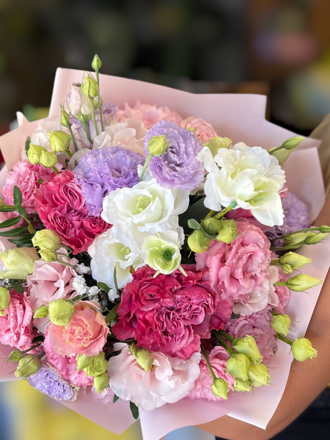 Ez a csokor a pasztell színek nyugalmát és a gazdag virágfelületet ötvözi. A rózsaszín, fehér és halvány lila virágok egymás mellett puha, telt összképet adnak, amit a friss bimbók és apró kiegészítők tesznek még élőbbé.
