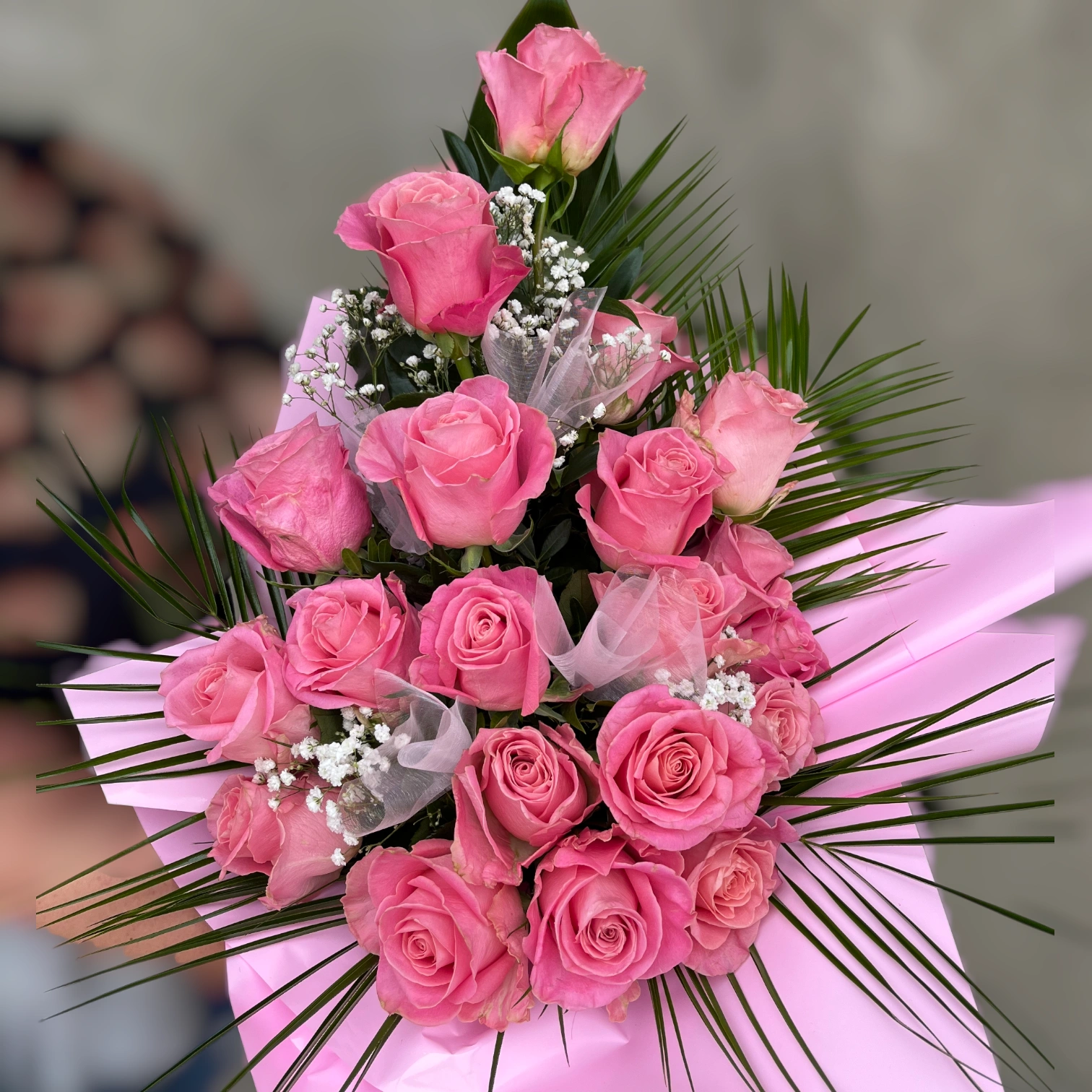 Ez a csokor a klasszikus rózsacsokrok hangulatát hozza vissza. A rózsaszín rózsák egymás fölé építve, zöld levelekkel és apró fehér kiegészítőkkel alkotnak gazdag, mégis letisztult összképet.