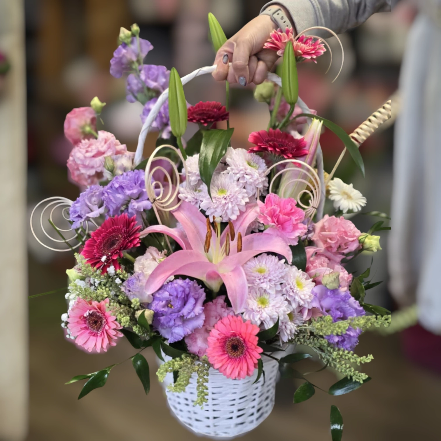 Ez a virágos kosár könnyed, tavaszias hangulatot hoz. A rózsaszín, lila és krém árnyalatú virágok egy fehér fonott kosárban kapnak helyet, középpontban a liliommal, amely különleges megjelenést ad az összeállításnak.
