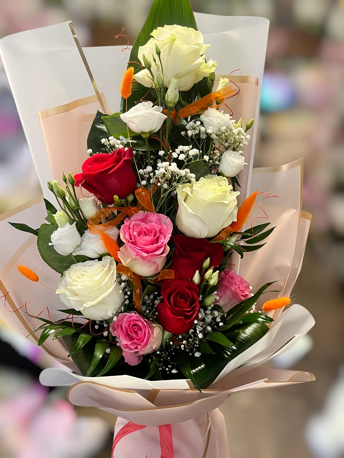 Ez a csokor többféle rózsából áll, fehér, piros és rózsaszín árnyalatokkal. Nem túl szabályos, inkább természetes hatású összeállítás, friss zöldekkel és apró kiegészítőkkel.