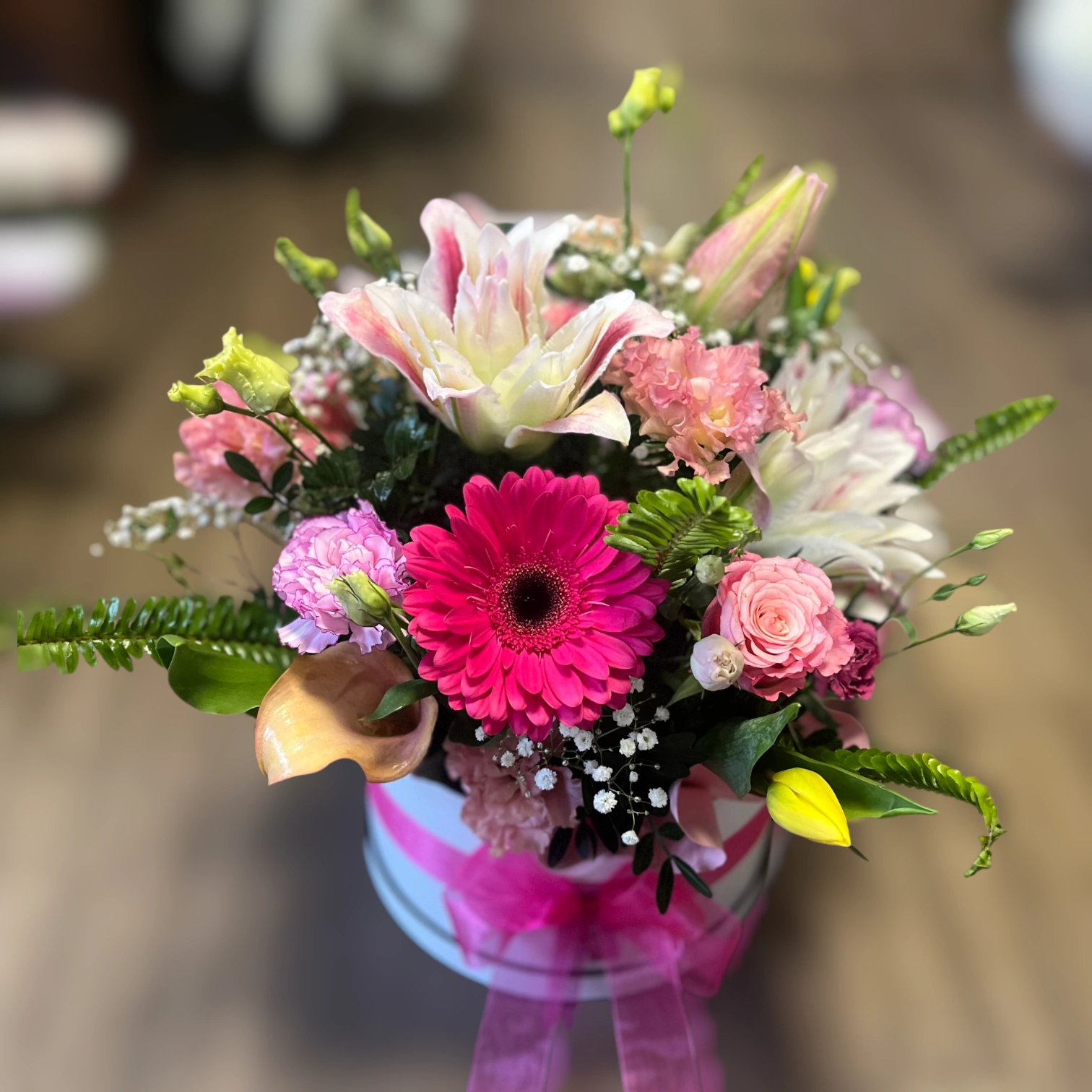 Ez a virágbox igazán élénk és játékos hangulatú összeállítás. A rózsaszín és pasztell árnyalatú virágok mellett egy karakteres gerbera adja meg a kompozíció középpontját, amit finom zöldek és apró kiegészítők tesznek teljessé.